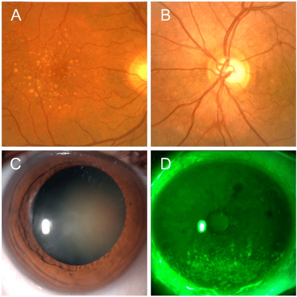 年龄相关性黄斑变性是发达国家成年人视力丧失的主要原因之一,由于负责清晰和高分辨率视力的黄斑区光感受器退化而发生。黄斑变性逐渐导致视力丧失,随后显著影响患者的生活质量和日常生产力。光感受器暴露于光和氧的广泛氧化应激中,因此每天外侧 10% 的光感受器片段会脱落[35]。随后 的碎片被视网膜色素上皮(RPE)吞噬并清除,RPE 执行包括光吸收、上皮运输和分泌以及免疫调节等多种功能[36]。由于 RPE 功能障碍,局部稳态平衡被打破,Bruch 膜–RPE 区域可能发现玻璃膜疣,这是早期和/或干性 AMD 的已确立临床指标,如图 2A 所示。这些不可消化的物质积累可能导致外段的机械位移并改变光感受器与脉络膜毛细血管之间的营养交换途径[37]。先前研究虾青素对光诱导视网膜损伤保护作用的作者已证实其有益作用[31,38,39]。在 Otzuka 的研究中,虾青素 100 毫克/公斤抑制了光诱导视网膜损伤小鼠模型中通过视网膜电图(ERG)和外核层(ONL)厚度评估的视网膜功能障碍。此外,它同时减少了细胞氧化应激,如 8‑羟基‑脱氧鸟苷(8‑OHdG)水平的降低所示[39]。