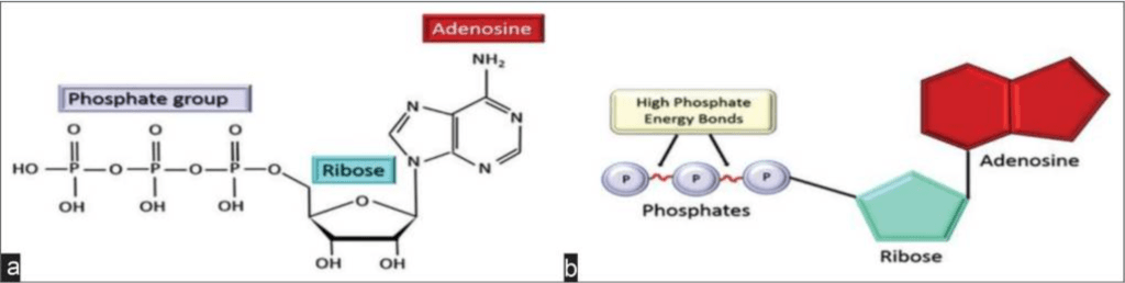 D-核糖是ATP分子的一种能量产生基质,常被称为“分子货币”,因为它在细胞内能量传递中的作用。腺苷三磷酸由磷酸、核糖和腺苷基团组成,这些基团通过分子内的两个高能磷酸酐键连接。(图2)【34】